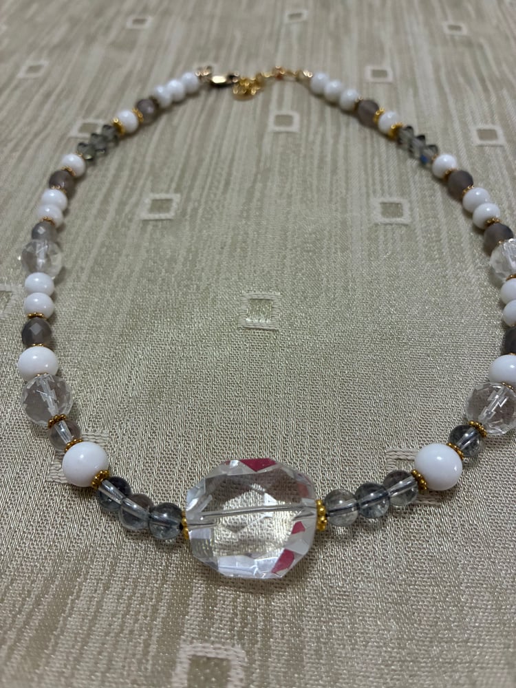 A crystal focal gem quickly draws the eye to this necklace of casual elegance. White agate, crystal beads 15 inches long with a 1 3/4 inch extension gold chain