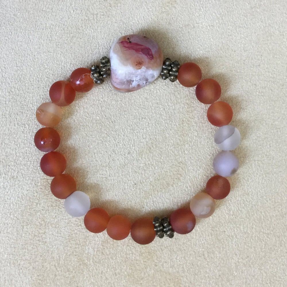 Carnelian and quartz stretch bracelet. Carnelian is thought to restore vitality, stimulate creativity, sharpen focus, treat depression and arthritis, and boost fertility. Clear quartz is considered the "master stone" with revitalizing qualities.